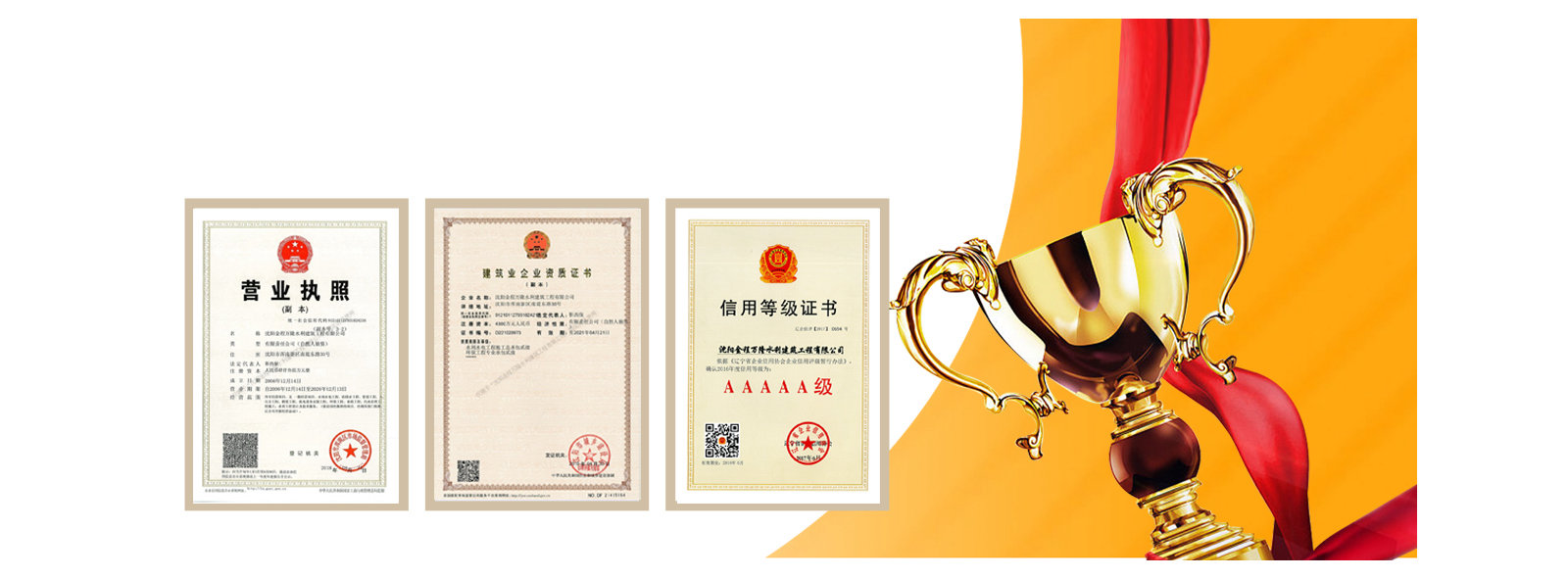 我公司先后受到遼寧省建筑業(yè)協(xié)會(huì)的好評(píng),遼寧省及沈陽(yáng)市工商局頒發(fā)的重合同守信譽(yù)企業(yè)稱號(hào),勞動(dòng)保障監(jiān)察書面誠(chéng)信等級(jí)A,信用遼寧網(wǎng)站公示AAA等級(jí),信用沈陽(yáng)網(wǎng)站公示AAA等級(jí),水利安全生產(chǎn)標(biāo)準(zhǔn)化二級(jí)單位,中國(guó)水利工程協(xié)會(huì)信用AAA等級(jí),